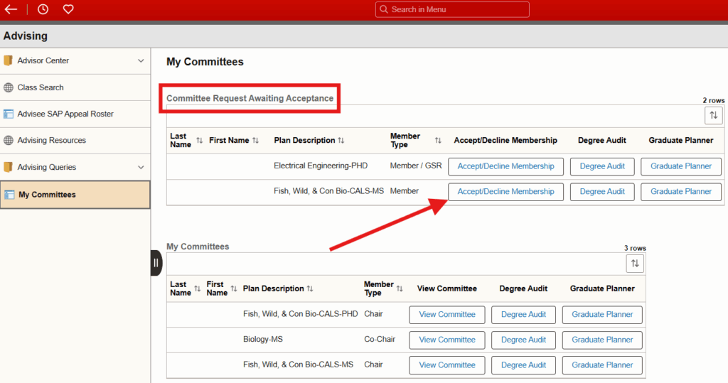 In the My Committees page, the section at the top will list committee requests awaiting your review. You may use the buttons there to view the student’s degree audit and Planner (if you wish), then click the “Accept/Decline Membership” button to enter your decision: